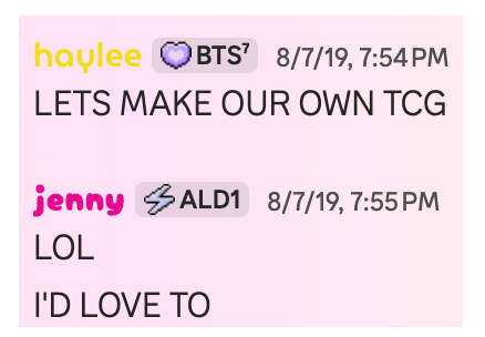 The first time the idea for our own TCG had ever been brought up was back in 2019. A whole 7 years ago now! It was after playing the old kpop TCG Idolise for about a year at that point. Since Idolise was alive and well we didn't immediately act upon that idea. But we never forgot about our plan! Idolise was more than enough work back then anyway. We still always continued to gather inspirations until we finally came up with our first mockup of a card template in 2020. Nothing was set in stone, yet. And with Starlight by Cassidy opening in 2020 we put our plans on hold for a little bit longer! And as always life has a way to get in the way of things. We always talked about getting back to work on it someday. And in 2025 we finally seriously discussed the possibility of opening our own TCG. So we got help from Aki and set up Stack ourselves for the very first time. Getting our own host like actual admins! Sadly we didn't manage to finish in time to open before 2026, but we did finally open for pre-prejoin in January of 2026! kosmos finally felt real and our baby was ready to open soon enough!